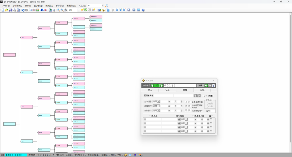 ▲無名の配偶者がすべて同一人物として扱われているようだ.このため,子ども氏名が中吊りにならず,バランスを崩した形で表示されている.いや,中吊りにならないのは別の理由ではないか?どうも,終端ノードしか中吊りになっていないようだ.